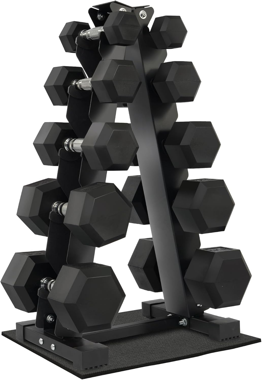 - 150 pounds set: 1x A-Frame rack (5-tier), pair of 5lbs, 10lbs, 15lbs, 20lbs and 25lbs
